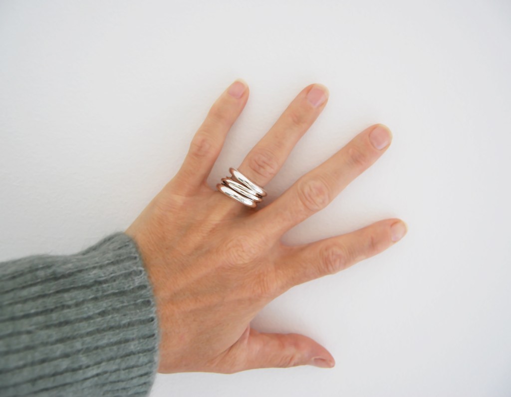 Looken blir chunky men samtidigt stilren. Vill du förändra kombinationen över tid kan du bära de två släta ringarna tillsammans i en minimalistisk combo…