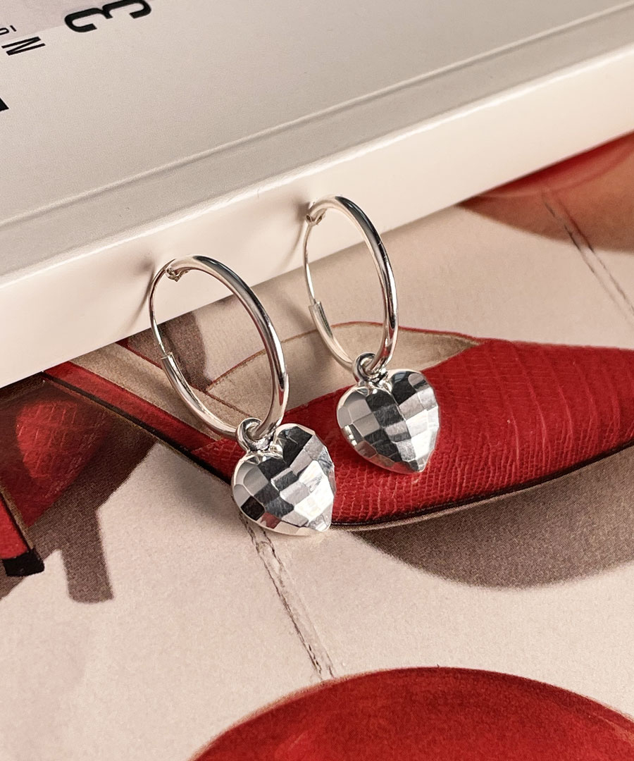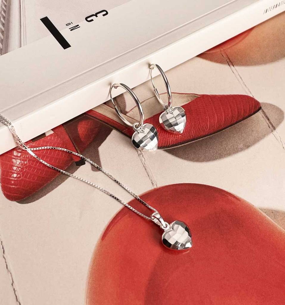 Halsband och hoop örhängen med facetterade och blanka silverhjärtan.