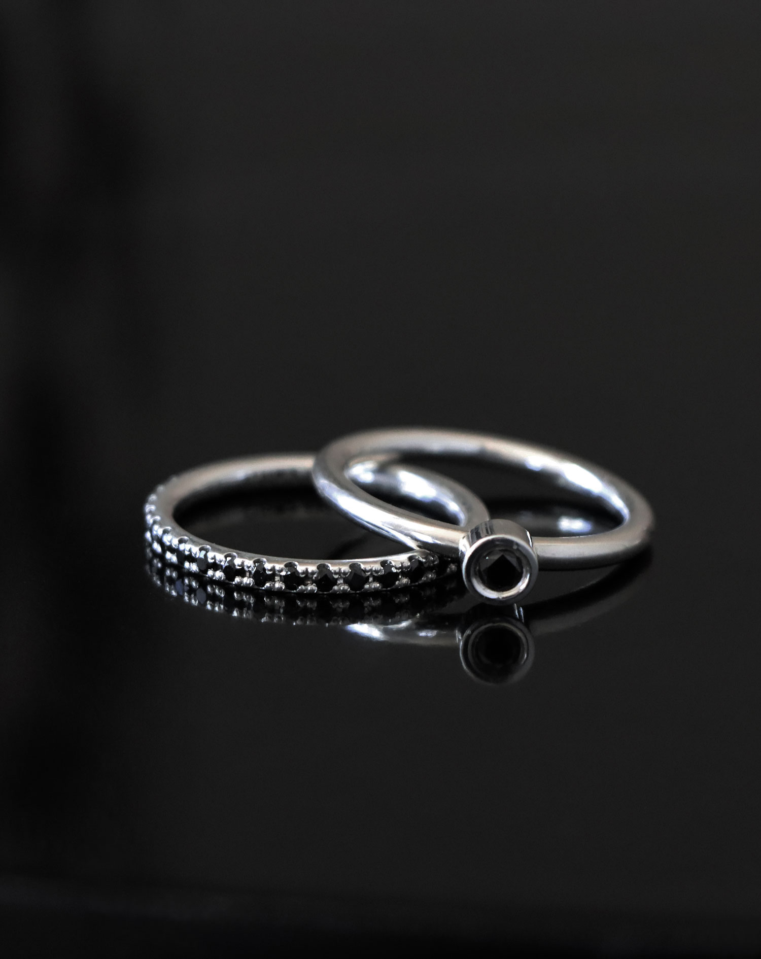 En halvalliansring och en enstensring. Ringarna finns med både vita och svarta diamanter.