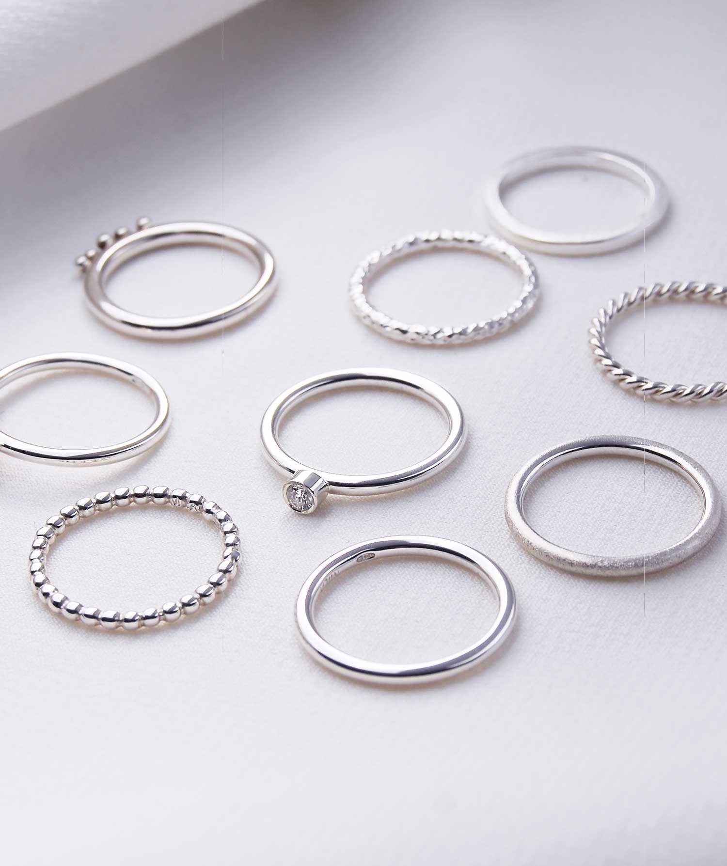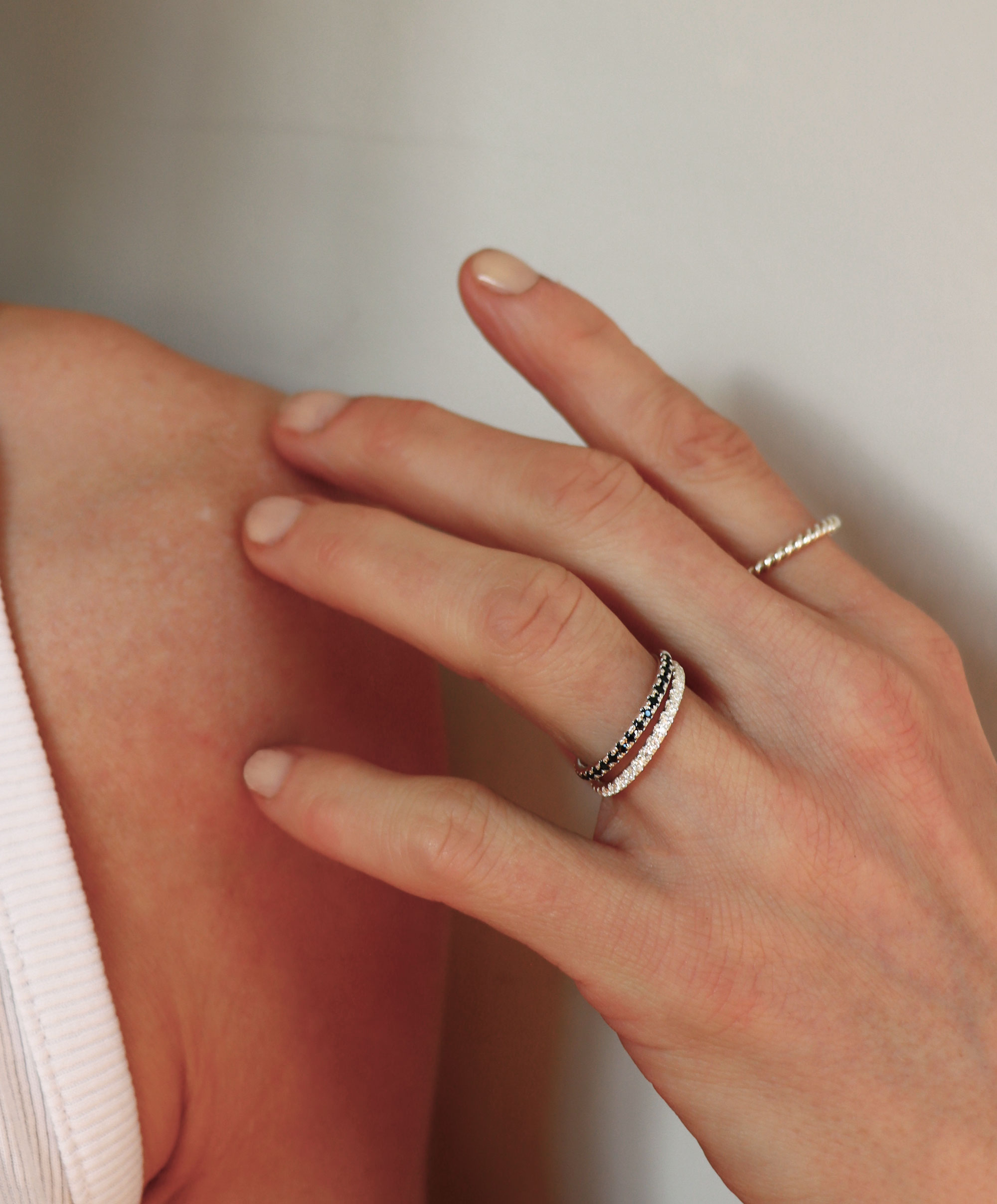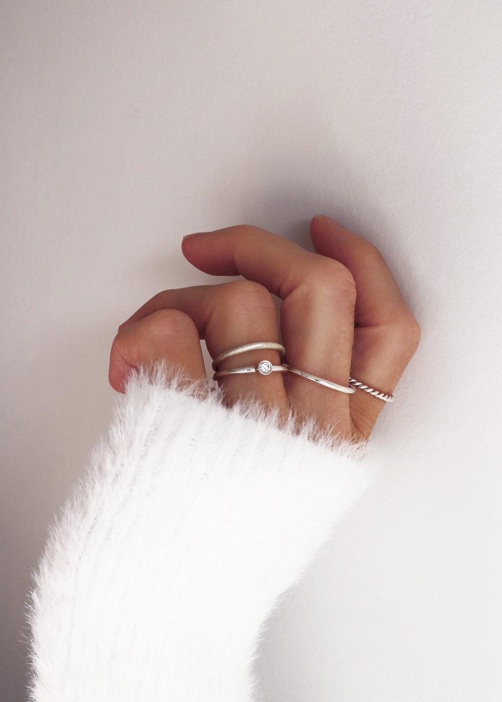 Ring stacking i sin mest självklara form är flera smala silverringar utspridda på flera fingrar. Bekvämt och personligt.