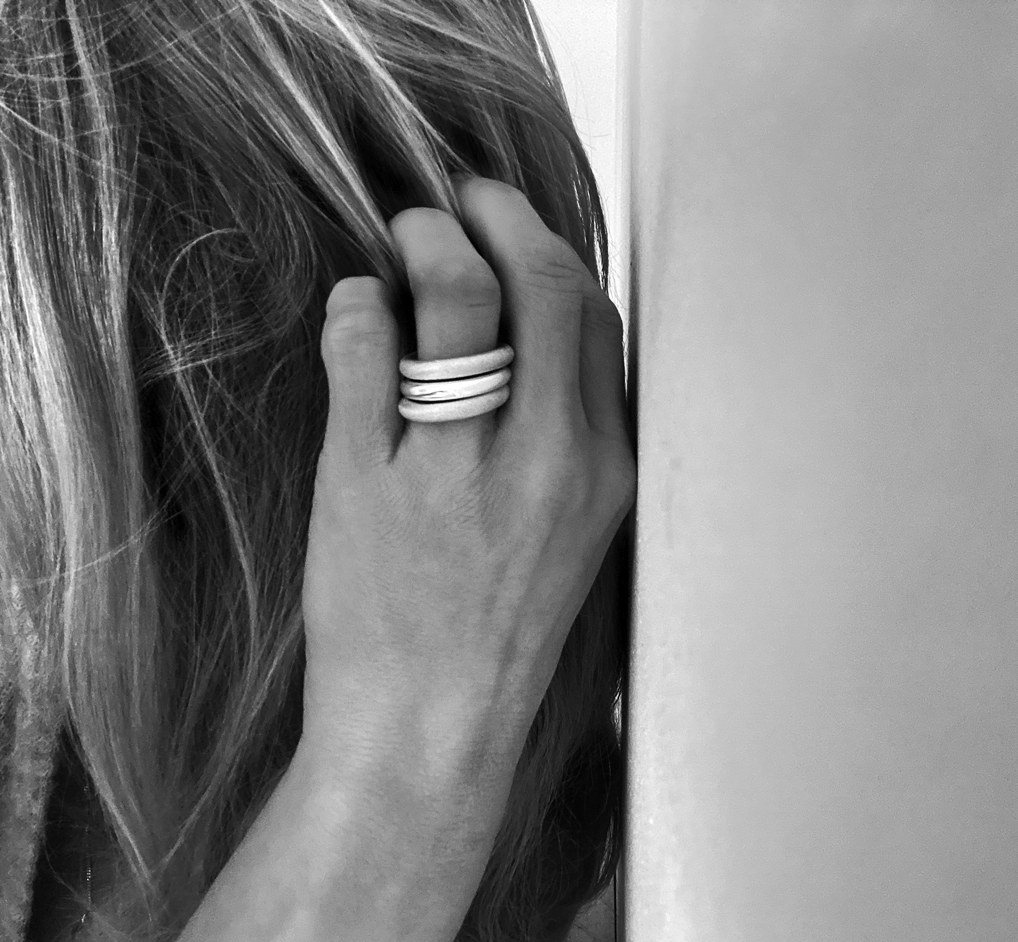 Smala silverringar på flera fingrar