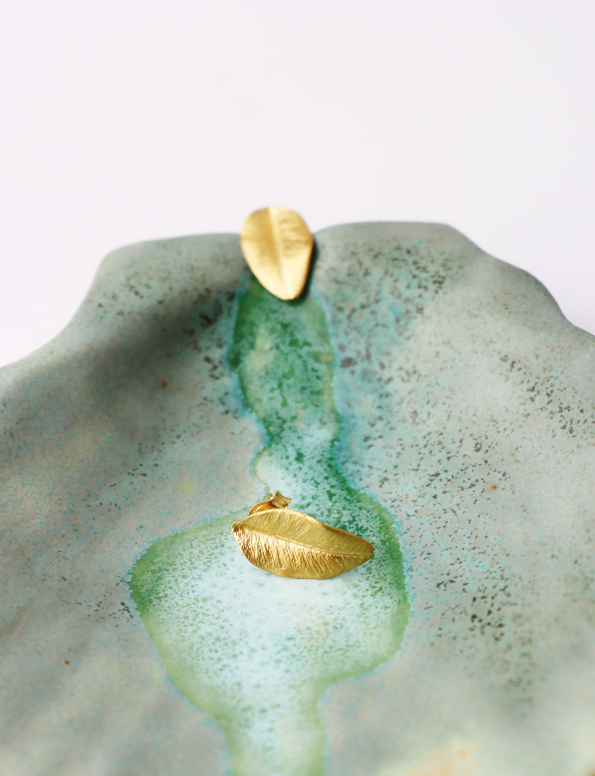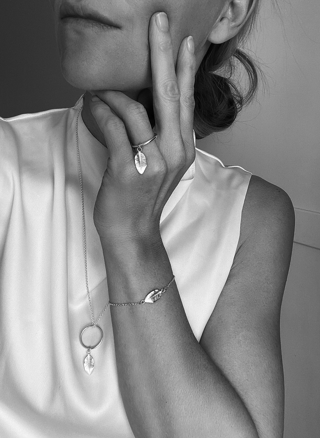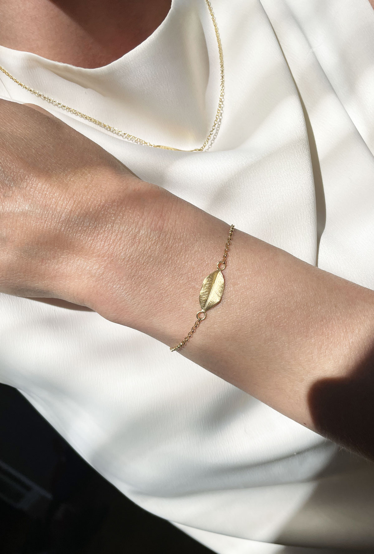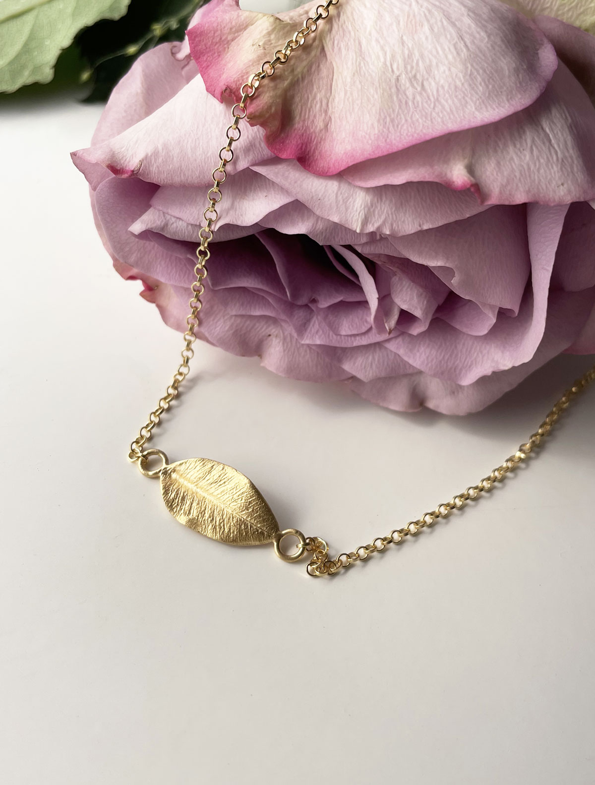 Bladets förlaga är ett naturligt rosenblad från en klätterros. Alla ådringar och detaljer är bevarade och bladen i alla smycken är exakta kopior av det naturliga rosenbladet. Ytan är matt och helt obearbetat.