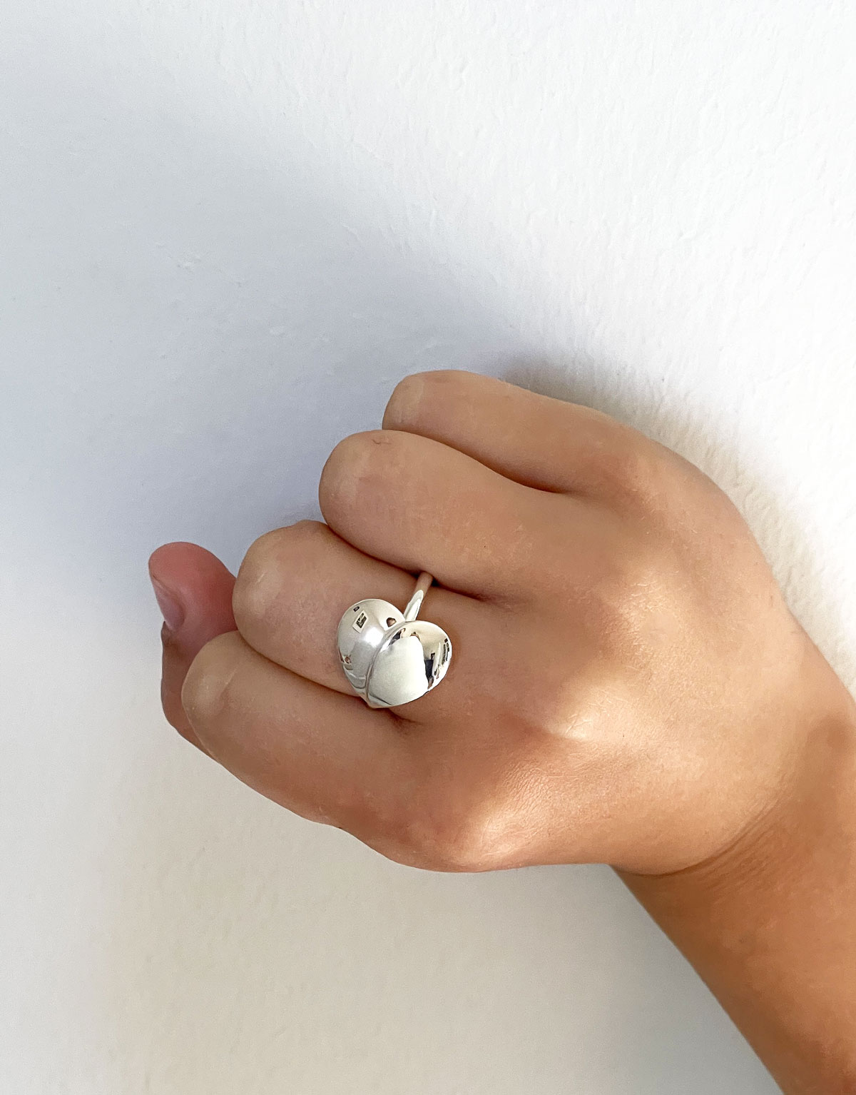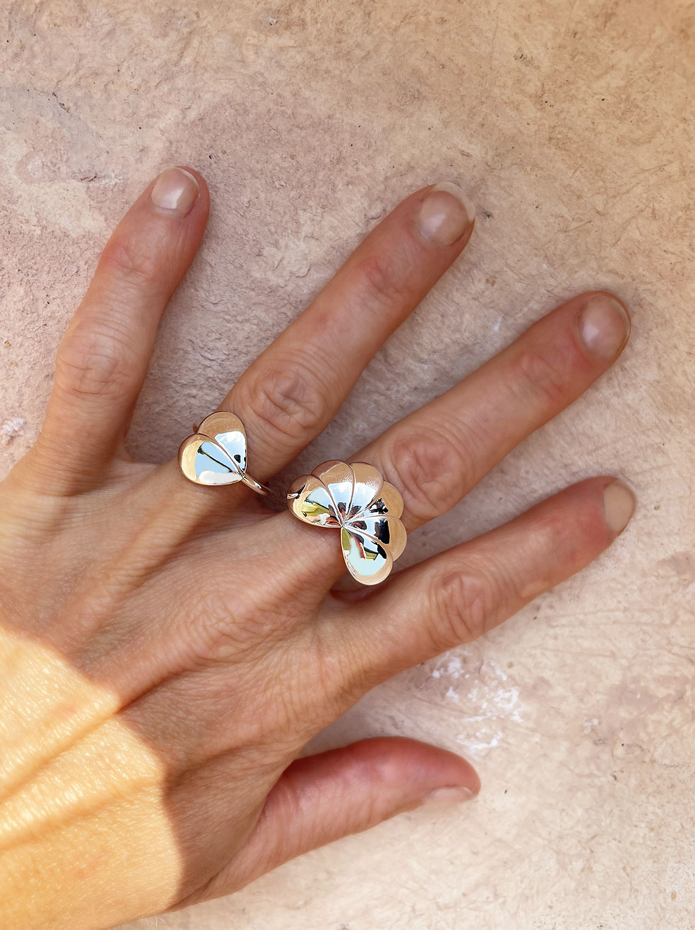 Vingarna är fästa på en silverring med raka kanter. Ringen passar att bära på långfingret eller pekfingret.