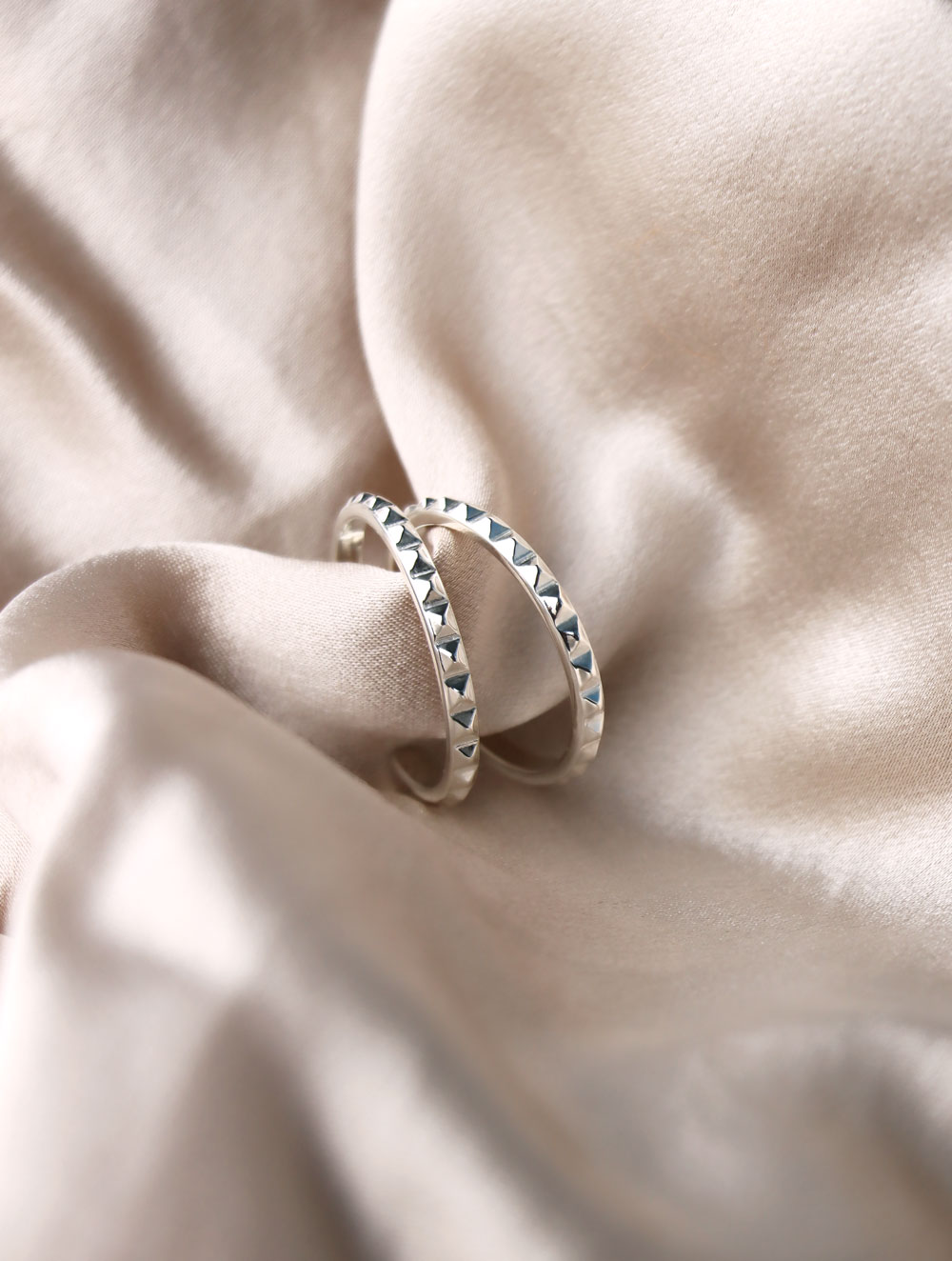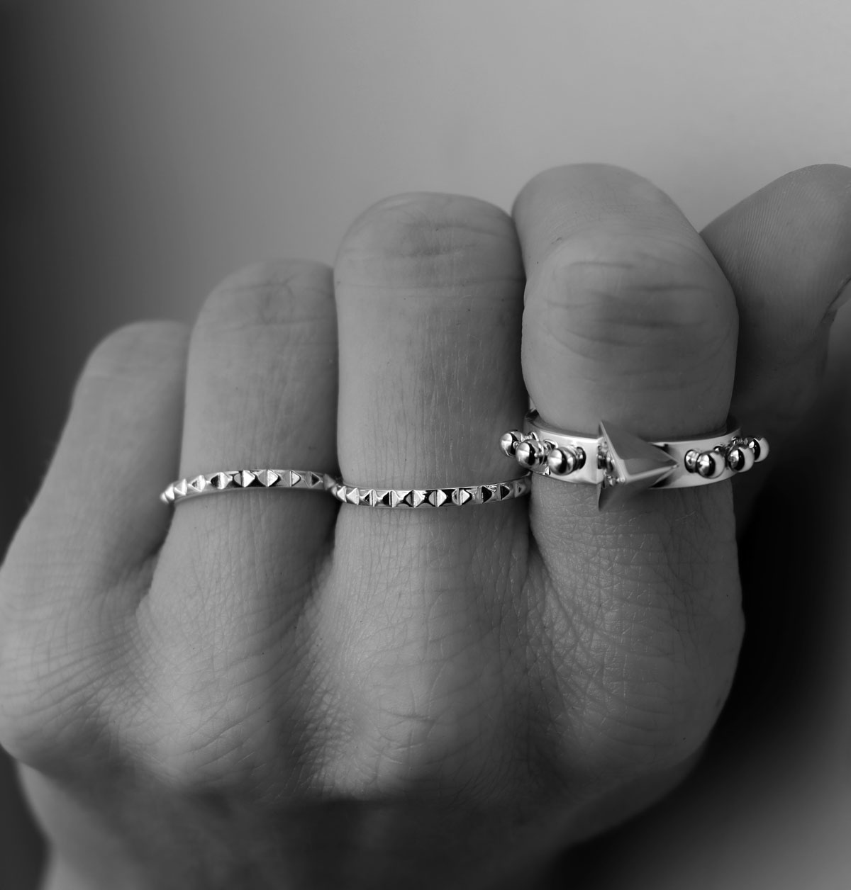 Armbandet och ringen har band av små silverkulor, likt en väg. Kulorna möts av en stor pyramidform som pikar.